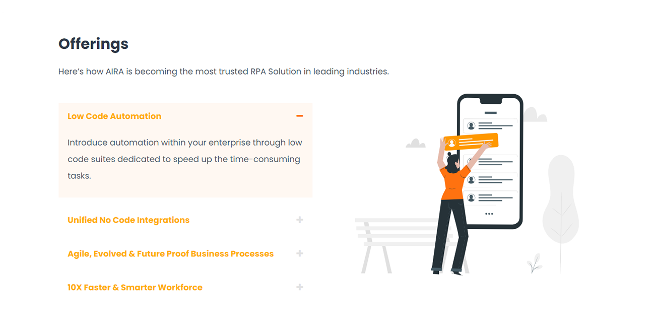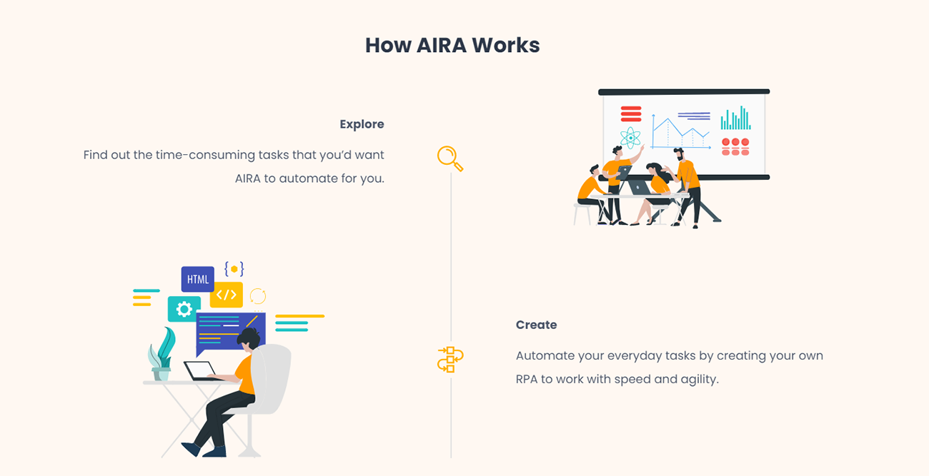 AIRA offers effective and scalable integration with digital technologies and legacy systems to free your workforce from labour intensive/low output tasks. It also allows you to craft your own automated workflows to build personalized low code/no code automation suite.